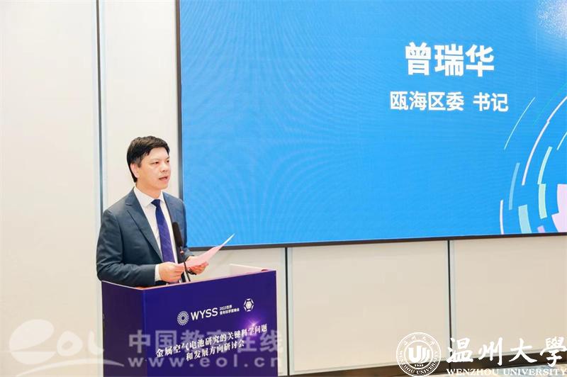 温州市瓯海区委书记曾瑞华致辞。他表示,瓯海区委区政府始终把生命健康、数字经济、新能源、新材料等新兴产业作为出圈之道、崛起之道,聚力攻克前沿的卡脖子难题,走出创新联合体路径,打造了中国基因药谷、中国(温州)双碳科创港等塔尖重器,抢占未来产业细分新赛道。近年来,瓯海区紧扣新能源百亿项目、千亿企业、万亿产业的目标,在专家学者的大力支持下,逐步探索构建储能电池正负极材料、电解液等全链条的生态体系,推动新能源产业逐步成为瓯海的优势,瓯海的特色,瓯海的标志,有力打响新能源中国看温州,温州看瓯海的平台。