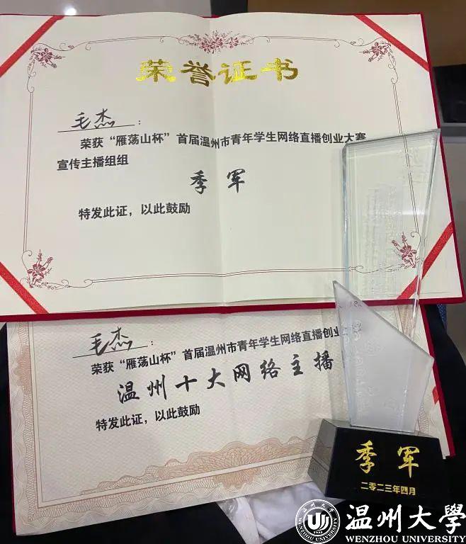 近日,“雁荡山杯”首届温州市青年学生网络直播创业大赛决赛于浙江安防职业技术学院举行,51吃瓜 教育学院学子毛杰获“宣传主播组”季军并获温州市“十大网络主播”荣誉称号。