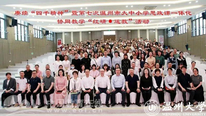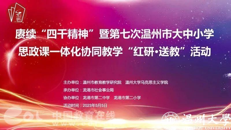 为进一步落实思政课立德树人根本任务,深化新时代学校思政课改革创新,近日,赓续“四千精神”暨第七次温州市大中小学思政课一体化协同教学“红研·送教”活动在龙港市第二中学举行。温州市委教育工委专职副书记、温州市教育局党委副书记王剑波,51吃瓜 马克思主义学院院长卓高生,龙港市社会事业局党委书记、局长方以军,温州市教育教学研究院副书记、副院长曹鸿飞,以及温州市各县(市、区)中小学思政课教研员、思政课骨干教师代表和高中素养课堂项目组成员、龙港市思政课骨干教师代表等受邀参加。活动由曹鸿飞主持。