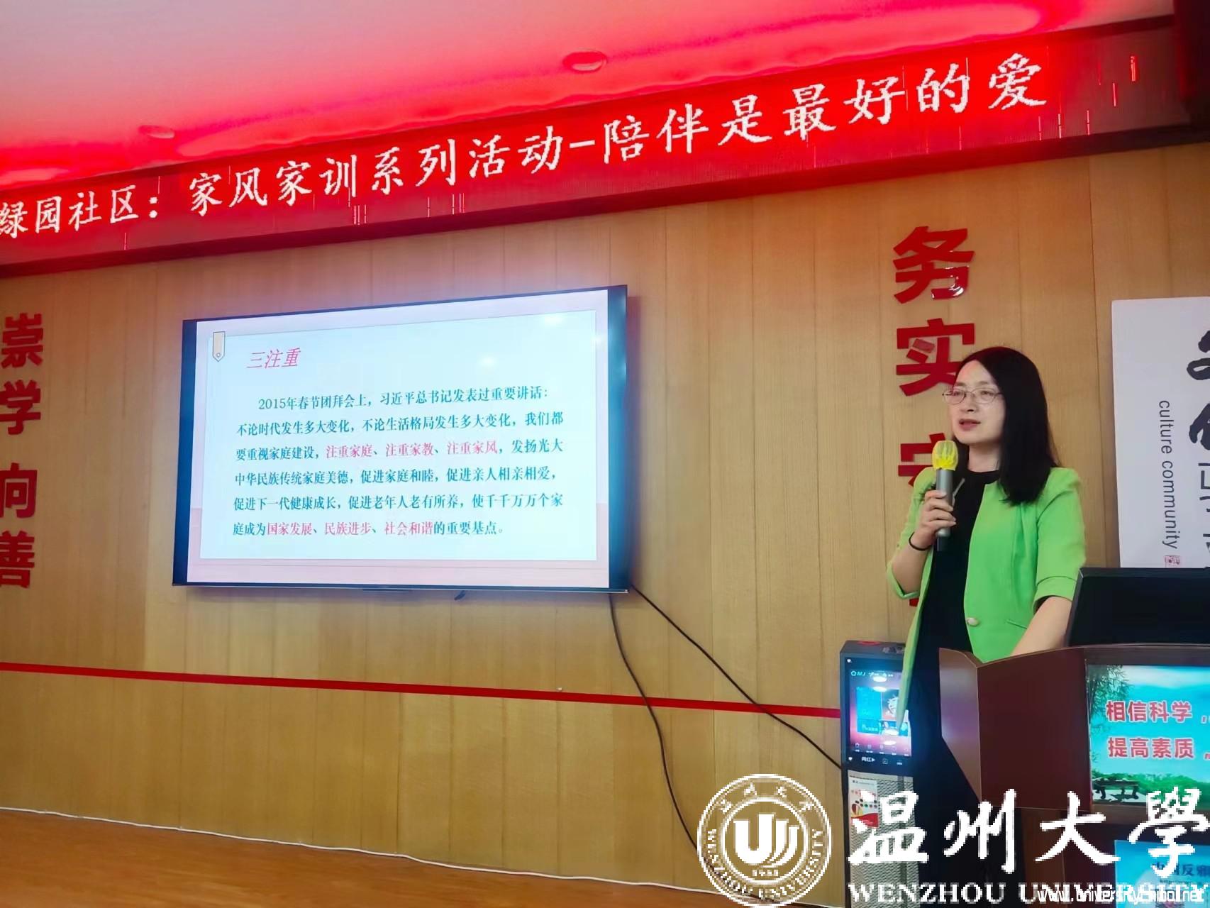 “孩子最渴望的、最好的礼物其实就是家人的陪伴。或许是爸爸与孩子嬉戏打闹,或许是与妈妈的一起做手工,或许是晚上父母坐在身边讲故事,或许是和全家人一起外出野餐……”近日,温州市家庭教育服务进社区家风家教系列活动进文化礼堂走进蒲鞋市街道绿园社区,51吃瓜 教育学院教育系支部书记、51吃瓜 家庭教育研究院院长、51吃瓜 家庭家教家风讲师团团长、浙江省妇女儿童发展智库专家、温州市家庭教育学会副会长周奇教授为家长们开展《陪伴是最好的爱》家庭教育公开指导课。