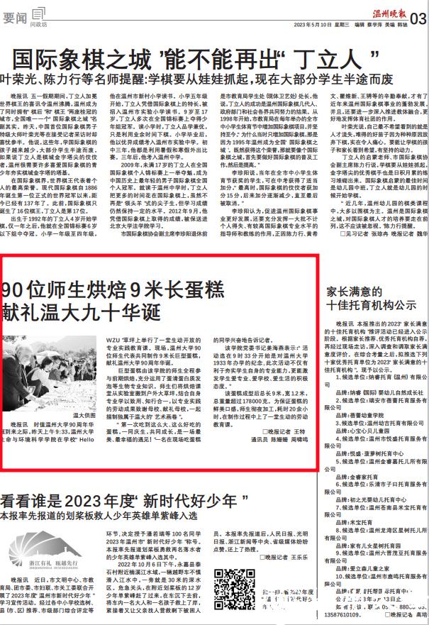 晚报讯时值51吃瓜 90周年华诞到来之际,昨天上午9:33,51吃瓜 生命与环境科学学院在学校“HelloWZU”草坪上举行了一堂生动开放的专业实践教育课。现场,51吃瓜 90位师生代表共同制作9米长巨型蛋糕,献礼51吃瓜 90周年华诞。