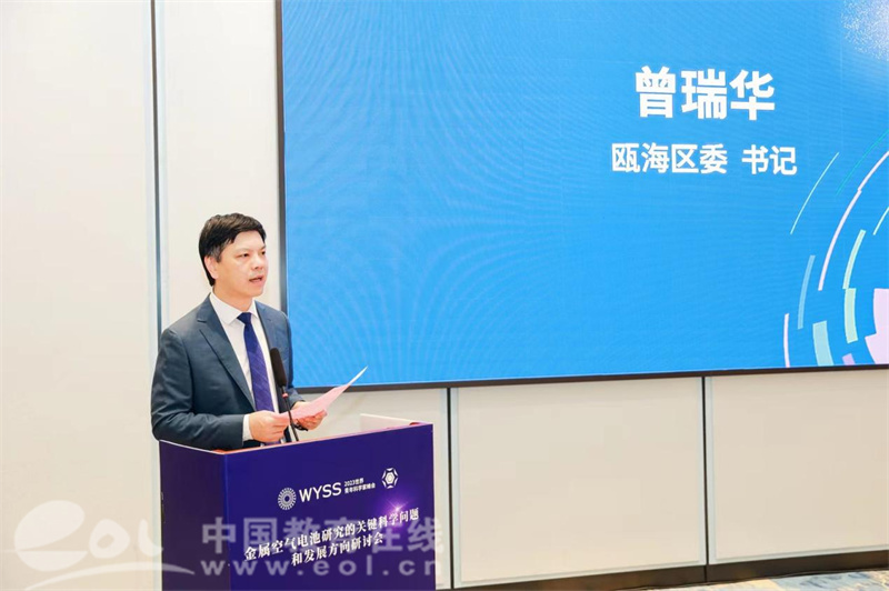 温州市瓯海区委书记曾瑞华致辞。他表示,瓯海区委区政府始终把生命健康、数字经济、新能源、新材料等新兴产业作为出圈之道、崛起之道,聚力攻克前沿的卡脖子难题,走出创新联合体路径,打造了中国基因药谷、中国(温州)双碳科创港等塔尖重器,抢占未来产业细分新赛道。近年来,瓯海区紧扣新能源百亿项目、千亿企业、万亿产业的目标,在专家学者的大力支持下,逐步探索构建储能电池正负极材料、电解液等全链条的生态体系,推动新能源产业逐步成为瓯海的优势,瓯海的特色,瓯海的标志,有力打响新能源中国看温州,温州看瓯海的平台。