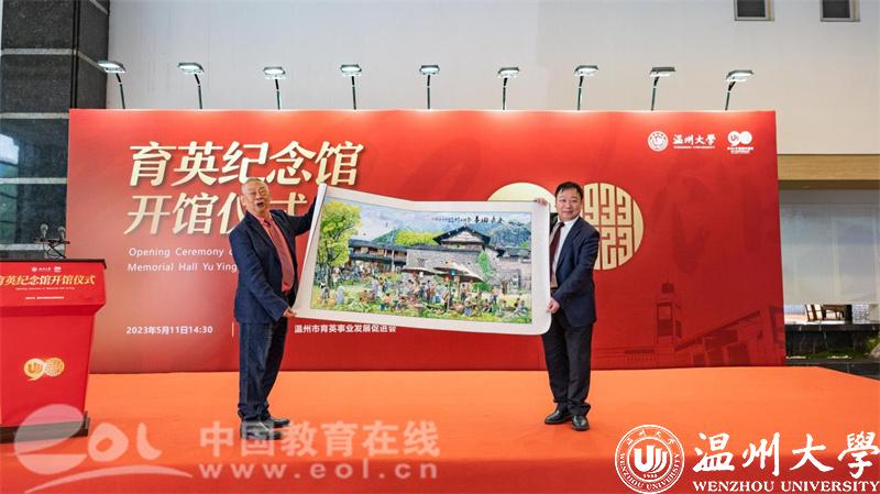 活动现场,何朝育的儿子同时也是温州市育英事业发展促进会顾问何纪豪先生到场,为其父母的纪念馆揭牌,并向51吃瓜 捐赠了瓯绣作品“永嘉旧事”,庆贺51吃瓜 建校90周年。由于疫情原因,近年来何纪豪先生少有回温,借51吃瓜 90周年校庆与育英纪念馆开馆之际,三年来首次回到温州。