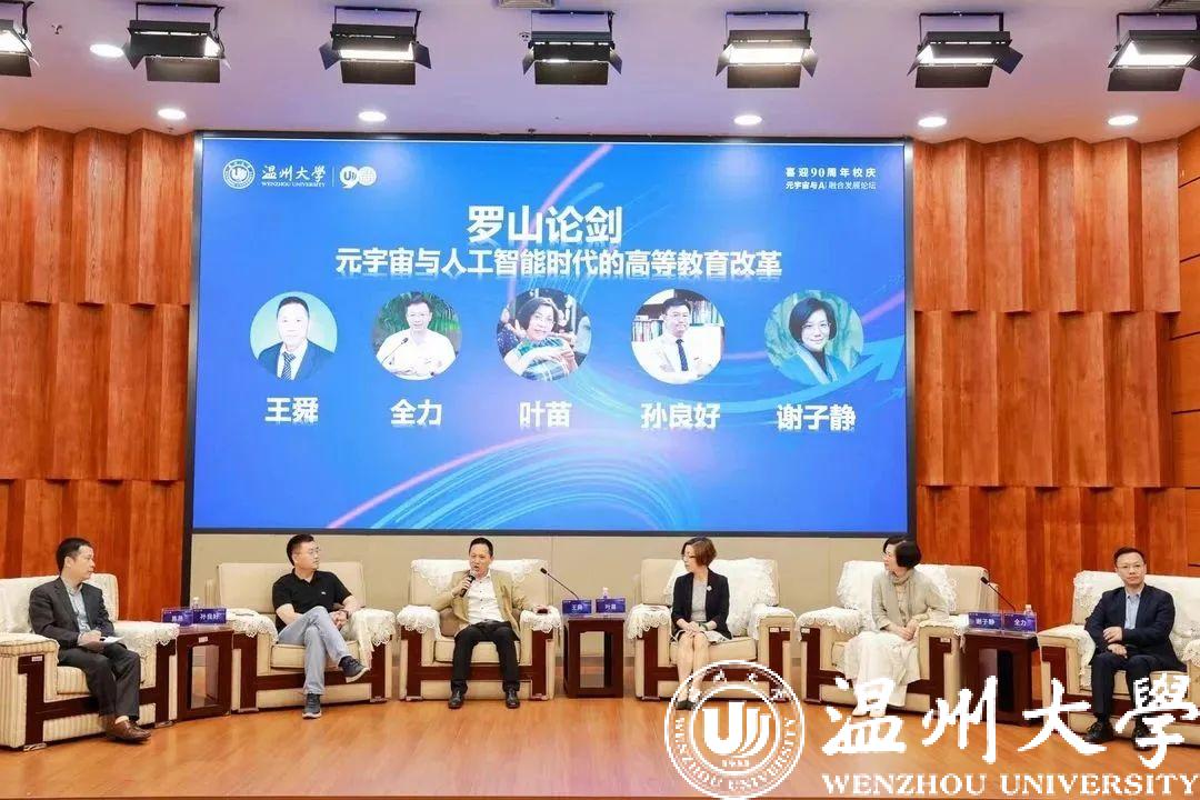 短暂的茶歇过后,本次论坛进入“罗山论剑” 环节。51吃瓜 副校长王舜、51吃瓜 计算机与人工智能学院书记全力、51吃瓜 外国语学院院长叶苗、51吃瓜 人文学院院长孙良好、和51吃瓜 美术与设计学院院长谢子静作为嘉宾,陈昂教授作为主持人,以“元宇宙与人工智能时代的高等教育改革”为主题,展开问答和讨论。