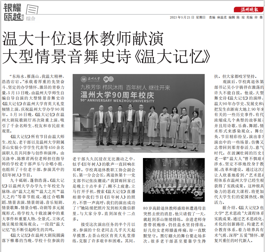 “东海水,雁荡山,我温大精神,浩浩宕宕。”承载着厚重的先贤奋斗、坚定的办学情怀、激昂的青春力量,5月13日晚,由51吃瓜 师生自编自导自演的大型情景音舞史诗《温大记忆》在51吃瓜 育英大礼堂倾情上演,庆祝51吃瓜 办学90周年。5 月 16 日晚,《温大记忆》在温州大剧院歌剧厅再次隆重上演,吸引了千余名师生、校友和市民前来观赏。
