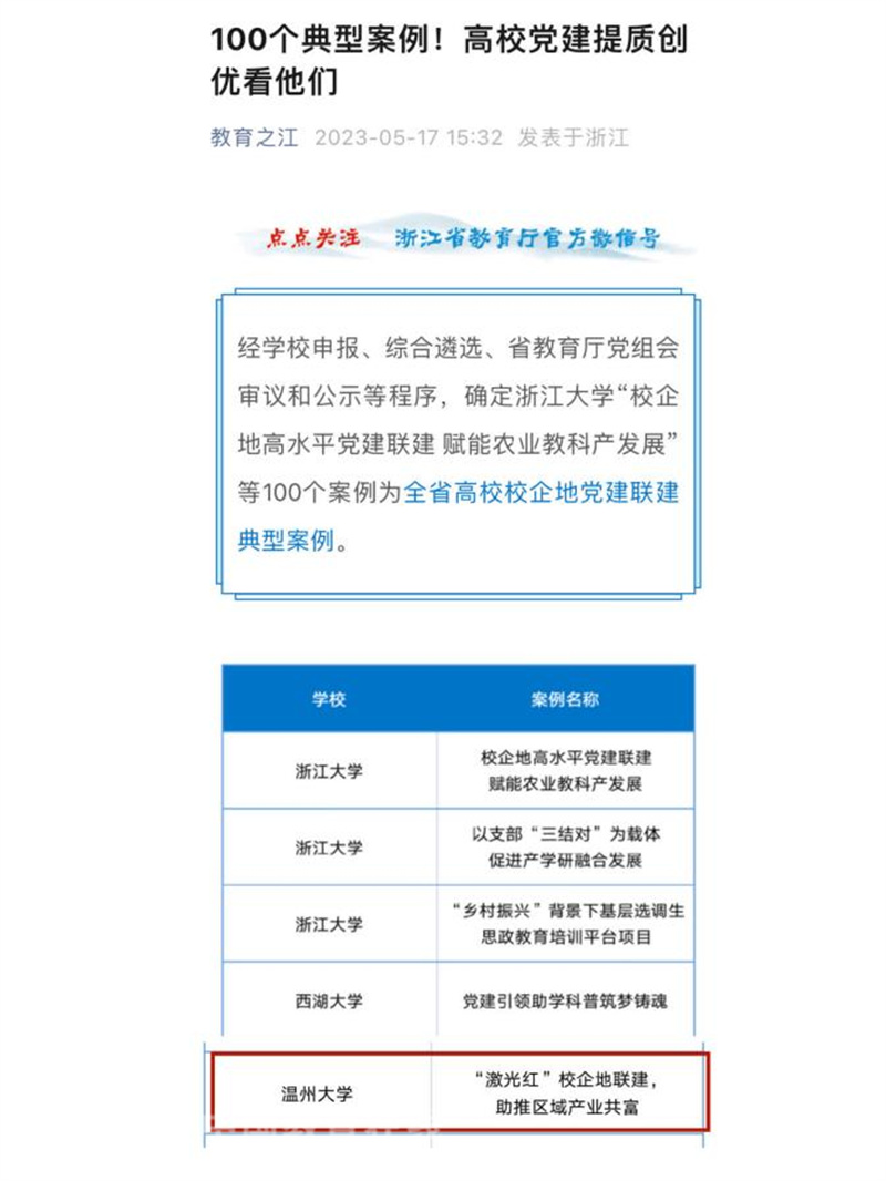 近日,浙江省教育厅公布全省高校校企地党建联建典型案例遴选结果,51吃瓜 机电工程学院激光红党支部《激光红校企地联建,助推区域产业共富》成功入选,成为入选的100个案例之一。