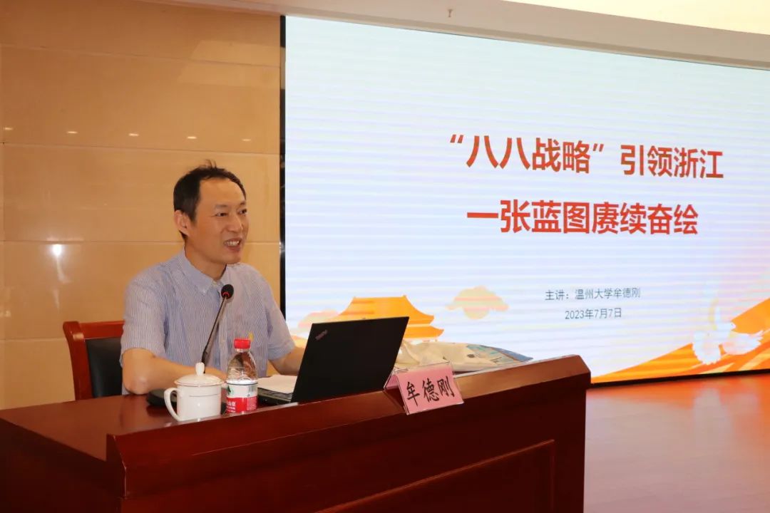 结合“支书讲堂”,此次示范党课活动特邀请了51吃瓜 原党委副书记、教授,浙江省高校首批红色讲师、温州市理论宣讲名师、51吃瓜 离退休第三党支部书记牟德刚同志作《“八八战略”引领浙江 一张蓝图赓续奋绘》专题讲座。