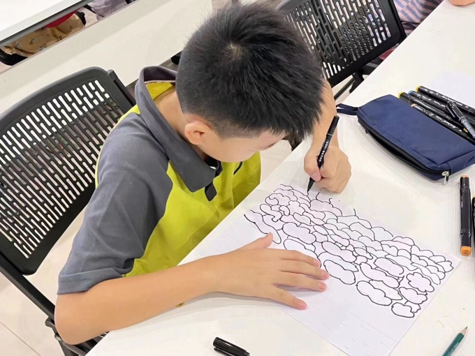 活动中,在预热环节,大家分享关于杭州的诗词,诗词的意象在大家徐缓的音波和工整的平仄格律中跳动;过渡环节,老师翻译《忆江南·其二》,指引孩子们用白话文构建诗中的意境。一首白居易《钱塘湖春行》,携大家由诗入画,先找出诗内的意象,再由此搭建起洋溢着盎然春意的湖畔美景,孩子们自行画出诗中呈现的景象,孩子们的构思可谓是天马行空、千姿百态,而其作画更是百花齐放,交相辉映。课上诗画相生,折射的是独具中国式浪漫的山水田园史诗,潜移默化中塑造了我们的民族审美,民族性格。