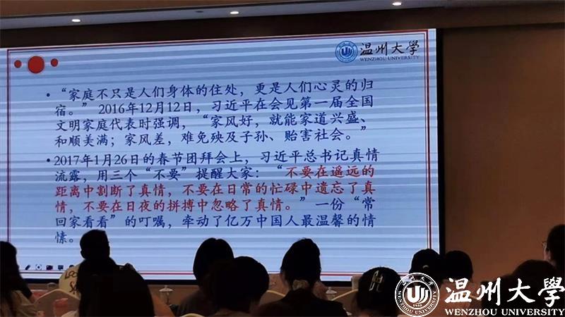 周老师从什么是家风、怎样传承优良家风、如何培育家国情怀、学做智慧父母等几个方面深入阐述了推动形成爱国爱家的家国情怀、建设相亲相爱的家庭关系、弘扬向上向善的家庭美德、体现共建共享的家庭追求。