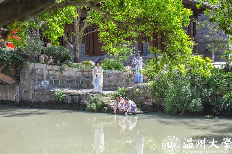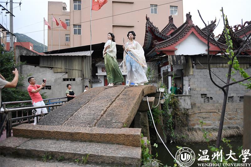 7月14日早上,团队来到温州梧田老街,模特身着宋代服饰,模拟宋代生活习惯、重现生活场景并进行宋韵塘河摄影创作。在河边捣衣戏水、在亭中摇扇赏景、在桥边吹风听鸣……在相机定格的一瞬,此情此景人们仿佛真的置身于宋代,千年塘河所散发的独特魅力、璀璨文物所展现的气韵都让人们沉浸其中。