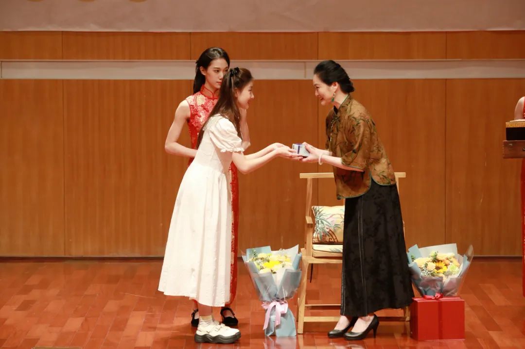 演出后,最先上台献花的便是李敏在温州新收的两位爱徒徐未和尉歆怡。贴心的李敏老师在谢幕时不忘把自己满怀的鲜花分享给空手的配角演员。
