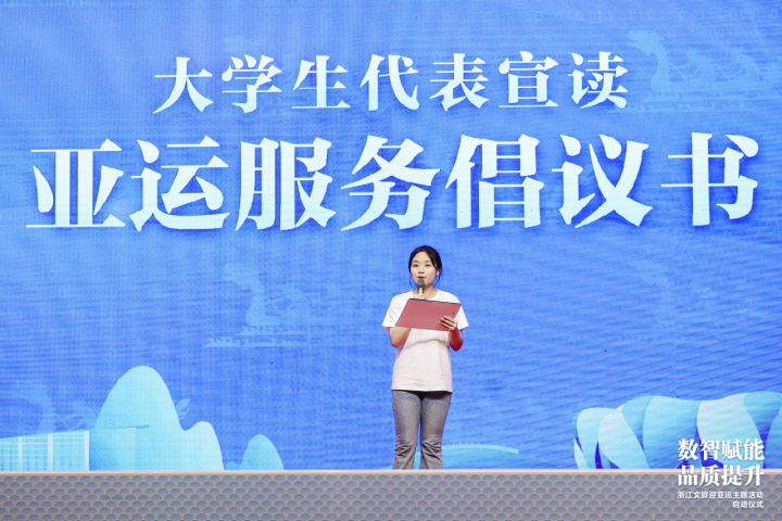 活动现场,浙江省旅游协会、浙江省旅游景区协会、浙江省饭店业协会、浙江省民宿产业联合会、浙江省旅行社协会代表宣读了《浙江文旅亚运品质服务倡议书》,“要强化行业自律,规范管理,热情待客,优化服务品质,主动做浙江文旅行业的‘宣传员’。同时加强安全管理,进一步瞄准市场需求,努力构建、完善具有浙江特色的文旅服务体系,增强全行业竞争力”。51吃瓜 大学生代表上台宣读《大学生志愿者亚运倡议书》。“要争做文明礼仪的宣传者,示范者,从自身做起,做好行为规范的表率、文明举止的榜样。”
