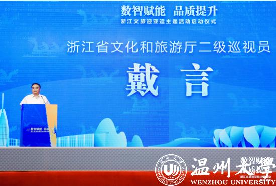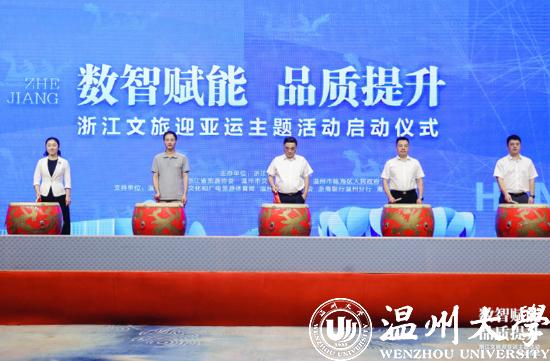 浙江省文化和旅游厅社会组织党委书记、二级巡视员戴言,浙江省旅游投资集团有限公司党委委员、副总经理,浙江省旅游协会副会长张雄文,温州市文化市场行政执法队队长余求红,温州市瓯海区委常委、宣传部长孟晓晨,浙商银行温州分行副行长王晓勇上台正式开启全省文旅迎亚运主题活动