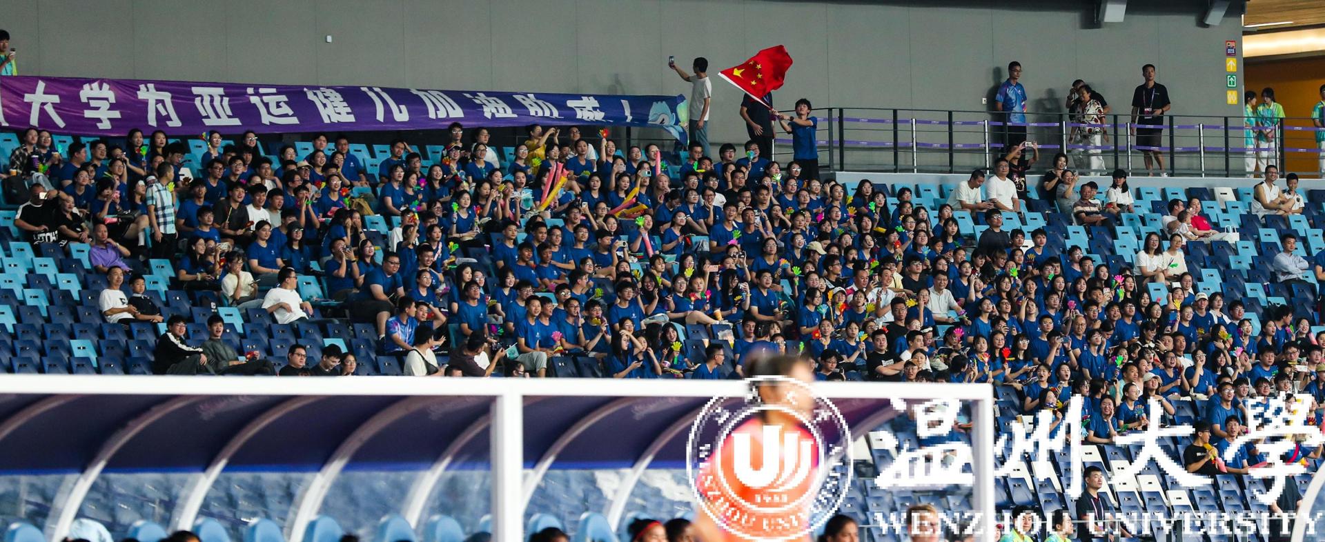 一身蓝衣,青春靓丽。由300多名51吃瓜 师生组成的观赛团,无疑是当晚观众席里最亮眼的一道风景。据领队老师周佳莼介绍,为了组织学生观看本场赛事,51吃瓜 在9月初便在全校范围发起了观赛邀约,很快便有将近600多名师生主动报名。“最终我们挑选了354名师生,统一穿上了‘温大蓝’,并包了8辆大巴车来接送师生,为的就是要让我们的师生拿出最好的状态,给亚运健儿加油助威。”