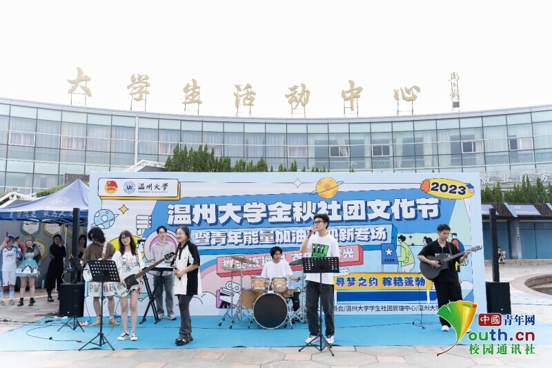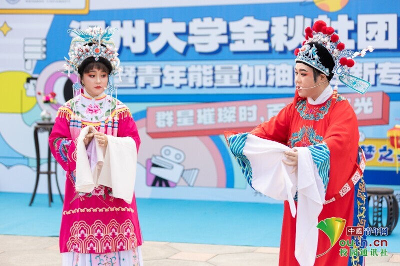 舞台区内,吉他协会、国标舞社等10余个学生社团带来的节目为现场的同学传递着青春的活力与能量,而由51吃瓜 红楼戏曲社、朗诵协会等学生社团带来的《打金枝》《红色的括苍山》等节目,则是让同学们沉浸式感受到中华优秀传统文化魅力及浙南浓厚的红色文化基因。