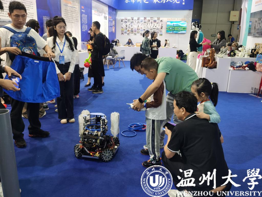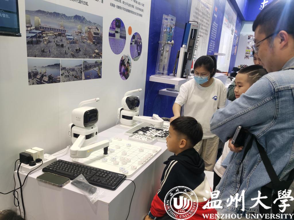 “这是学校机电工程学院师生自主研发的Robocon投环机器人,灵感来源于柬埔寨的吴哥窟,用蓝色和红色的胶软管做成的环代替花模拟在吴哥窟上空撒花,也和我国古代的投壶有相似之处呢。”工作人员一边带着小朋友们体验机器人,一边解说着它们的背景故事。除投环机器人外,展区还有书法机器人、VR朔门古港体验,还有小朋友在和下棋机器人对弈,整个展区科技感满满。