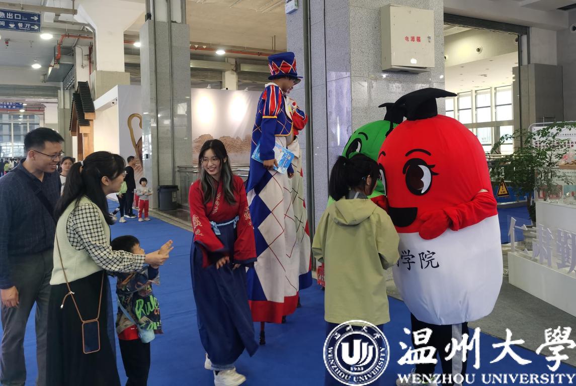 “宝宝,快看!好高的人啊!”温州乐园展区的小丑演员踩着高跷满展馆与大家进行互动表演,展区内还有可爱的羊驼和小朋友玩耍。在2号馆亲子阅读展区,“超级华容道”和“计客”智能军棋前也围满了正在进行头脑风暴的小朋友。