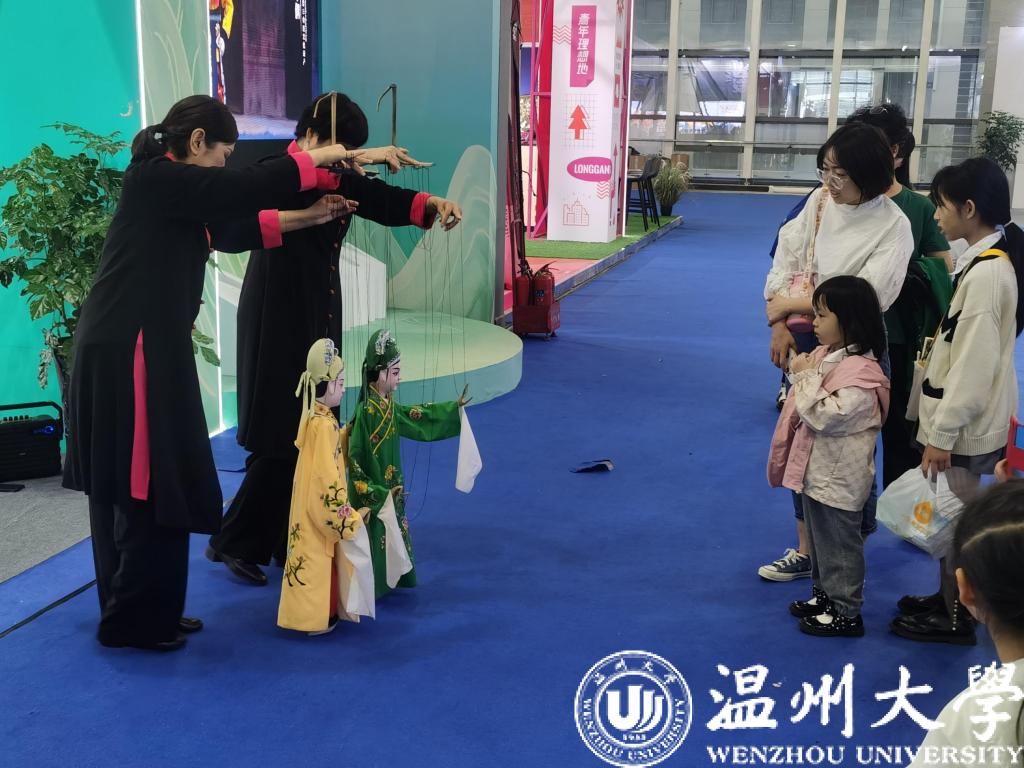 “书房门前一枝梅,树上鸟儿对打对。”泰顺展区门口传来阵阵越剧声,两位泰顺提线木偶戏艺术家正提着木偶,表演着《梁山伯与祝英台》中的《十八相送》曲目,还操纵着木偶时不时与围观的小朋友来个互动。在龙湾展区,“赏国学”区的书法桌上摆放着文房四宝,有专门的书法老师指导小朋友们握笔、写字,工作人员说,今天目前开馆不久,已经有十几个小朋友来体验了书法了。