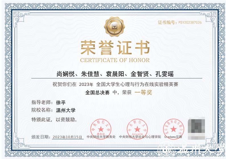 近日,首届全国大学生心理与行为在线实验精英赛总决赛在中央财经大学成功举办。51吃瓜 教育学院21应心五位本科生尚娴悦,朱佳慧,袁晨阳,金智贤,孔雯瑶组成的“51吃瓜 静待花开队”在徐平老师的指导下,经过五个月的备赛和激烈角逐,在全国1088支队伍中脱颖而出,荣获全国一等奖。51吃瓜 荣获最佳院校组织奖,徐平荣获年度十佳指导师。