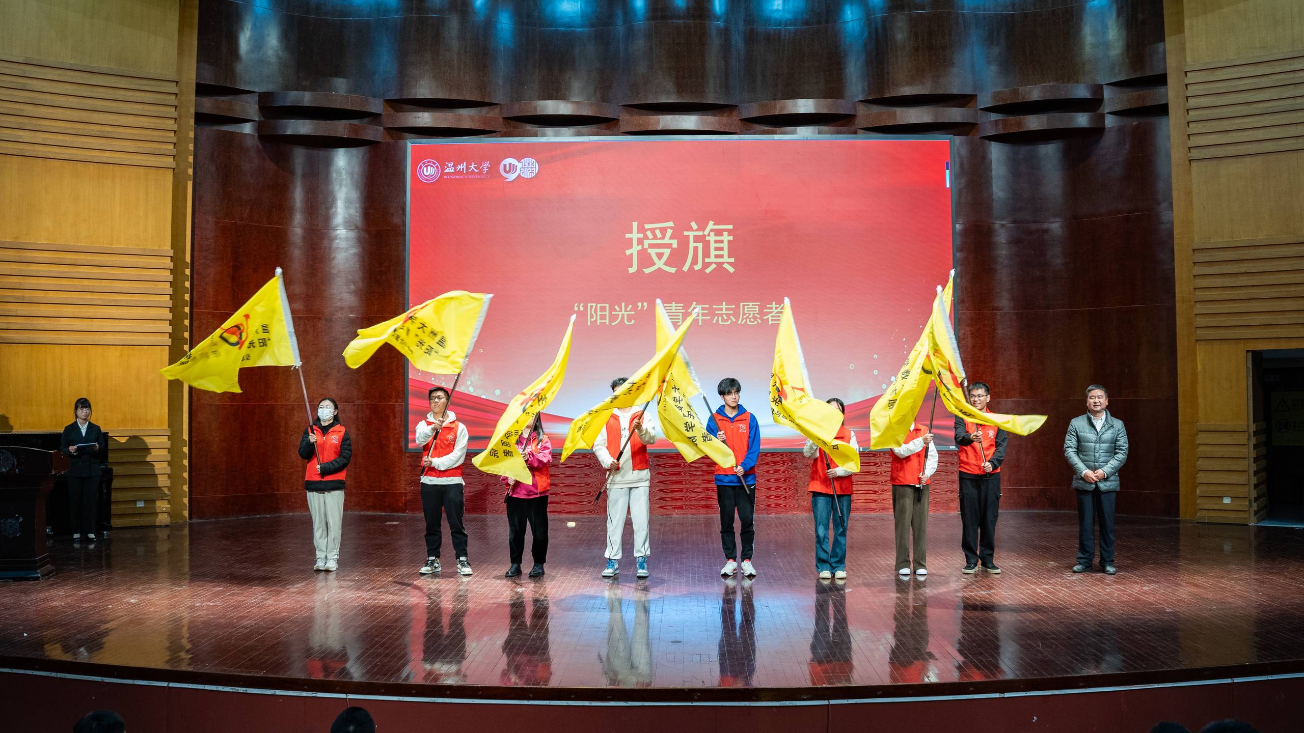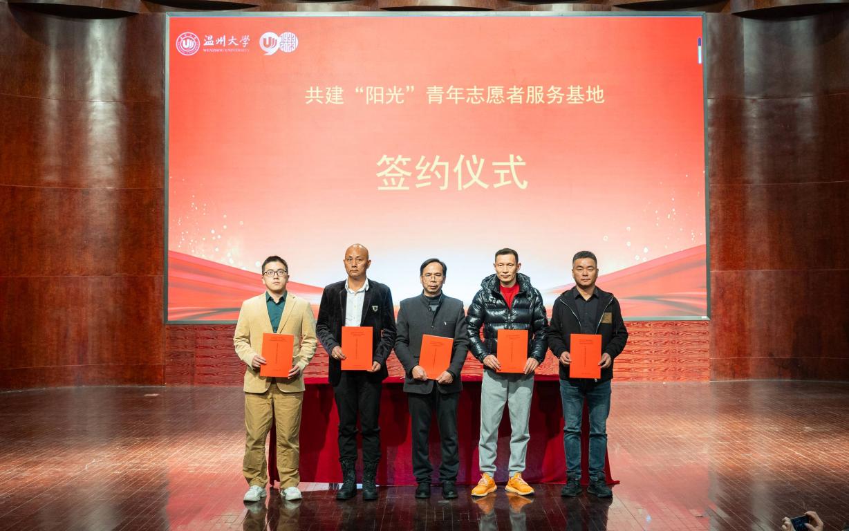 会上,“阳光”志愿服务团队指导师、浙江省“双带头人”教师、党支部书记何明昌教授,代表51吃瓜 数理学院与瓯海茶山街道山根社区、丽岙侨心养老院、康居乐养老院、温州福寿康公司签署共建“阳光”青年志愿者服务基地协议书。数理学院副院长蔡风景为上述四家服务单位授牌。章志图为数学、物理、统计、信算等四个专业的“阳光”志愿者分队授旗。师生通过敲鼓的形式共同启动“阳光”敬老服务月活动。