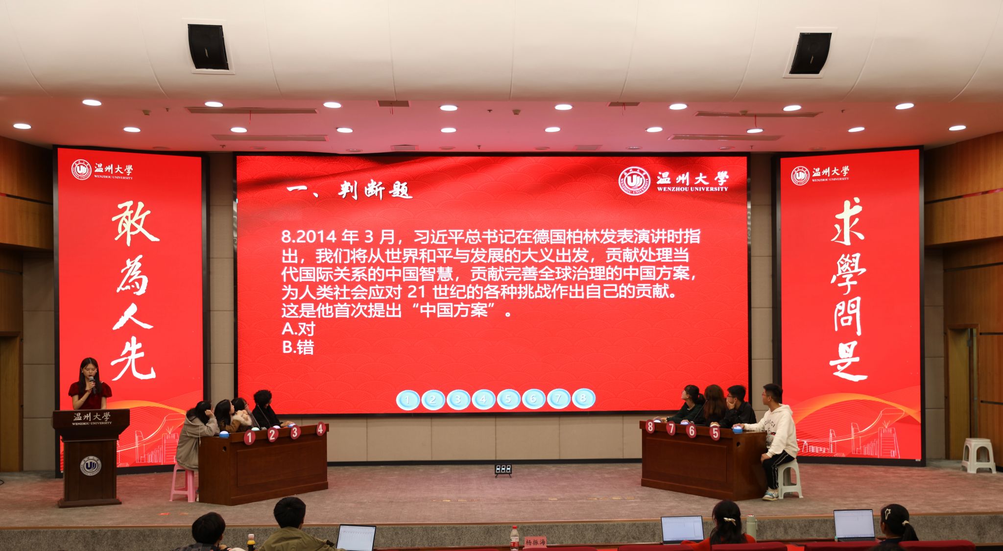 “习近平法治思想首次提出是在2020年11月16日至17日召开的中央全面依法治国工作会议!”“恭喜2号同学抢答成功!”……在育英图书馆二楼报告厅,51吃瓜 “习近平法治思想”知识竞赛如火如荼地进行中。知识竞赛重点围绕宪法知识、习近平法治思想、党的二十大报告相关内容,设有判断题、单选题、多选题和逻辑题。500余名学生参与到知识竞赛初赛环节,最终24名选手进入决赛。决赛现场紧张热烈,充分检验了大学生对习近平法治思想、宪法知识的掌握程度,将法治学习的知识性与趣味性融为一体。