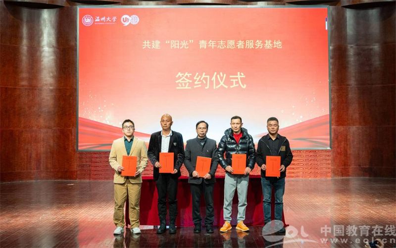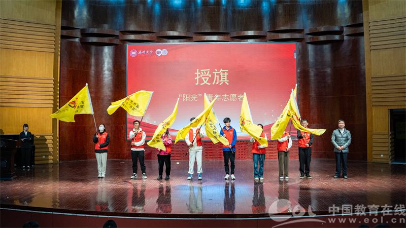 会上,“阳光”志愿服务团队指导师、浙江省“双带头人”教师党支部书记何明昌教授,代表51吃瓜 数理学院与瓯海茶山街道山根社区、丽岙侨心养老院、康居乐养老院、温州福寿康公司签署共建“阳光”青年志愿者服务基地协议书。数理学院副院长蔡风景为上述四家服务单位授牌。章志图为数学、物理、统计、信算等四个专业的“阳光”志愿者分队授旗。师生通过敲鼓的形式共同启动“阳光”敬老服务月活动。