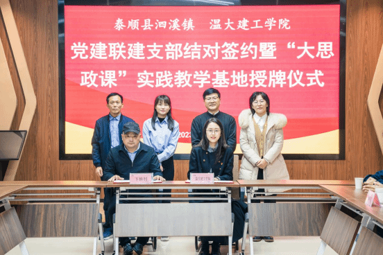 12月12日上午在泰顺县泗溪镇党群服务中心,51吃瓜 建筑工程学院两个本科生党支部同时与最美廊桥北涧桥、溪东桥所在地,泰顺县泗溪镇下桥村、白粉墙村党支部签订了党建联建支部结对协议书,并在泰顺廊桥文化园设立“大思政课”实践教学基地。