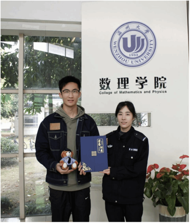 戚熠彬现为数理学院21级数学专业学生,也是学院学生会主席团成员,他从大一开始就坚持反诈宣传工作。近期,他参加瓯海茶山反诈分中心的志愿者工作,尽心尽责,积极普及反诈知识,多次劝阻受骗群众,得到了茶山派出所干警们的高度肯定,最终获评此项殊荣。