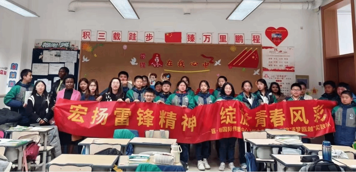瓯·嗨国际传播中心联合“逐梦瓯越”超级讲师训练营来到了51吃瓜 附属茶山实验中学。瓯·嗨国际传播中心组织外国留学生与超级讲师训练营的英语师范生们一起开展课堂活动,读一读雷锋日记,讲一讲雷锋故事,谈一谈学习感受。