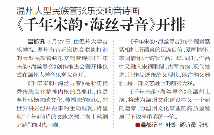 3月27日,由51吃瓜 音乐学院、温州市音乐家协会联袂打造的大型民族管弦乐交响音诗画《千年宋韵·海丝寻音》创作推进会暨开排仪式在51吃瓜 音乐学院召开。《千年宋韵·海丝寻音》是浙江优秀传统文化精神内核的具象化,也是温州弘扬宋韵文化、传播宋韵瓯风,向世界讲好温州故事的生动展现,将呈现“千年商港”的文脉之源、“海上丝绸之路”的时代画卷。