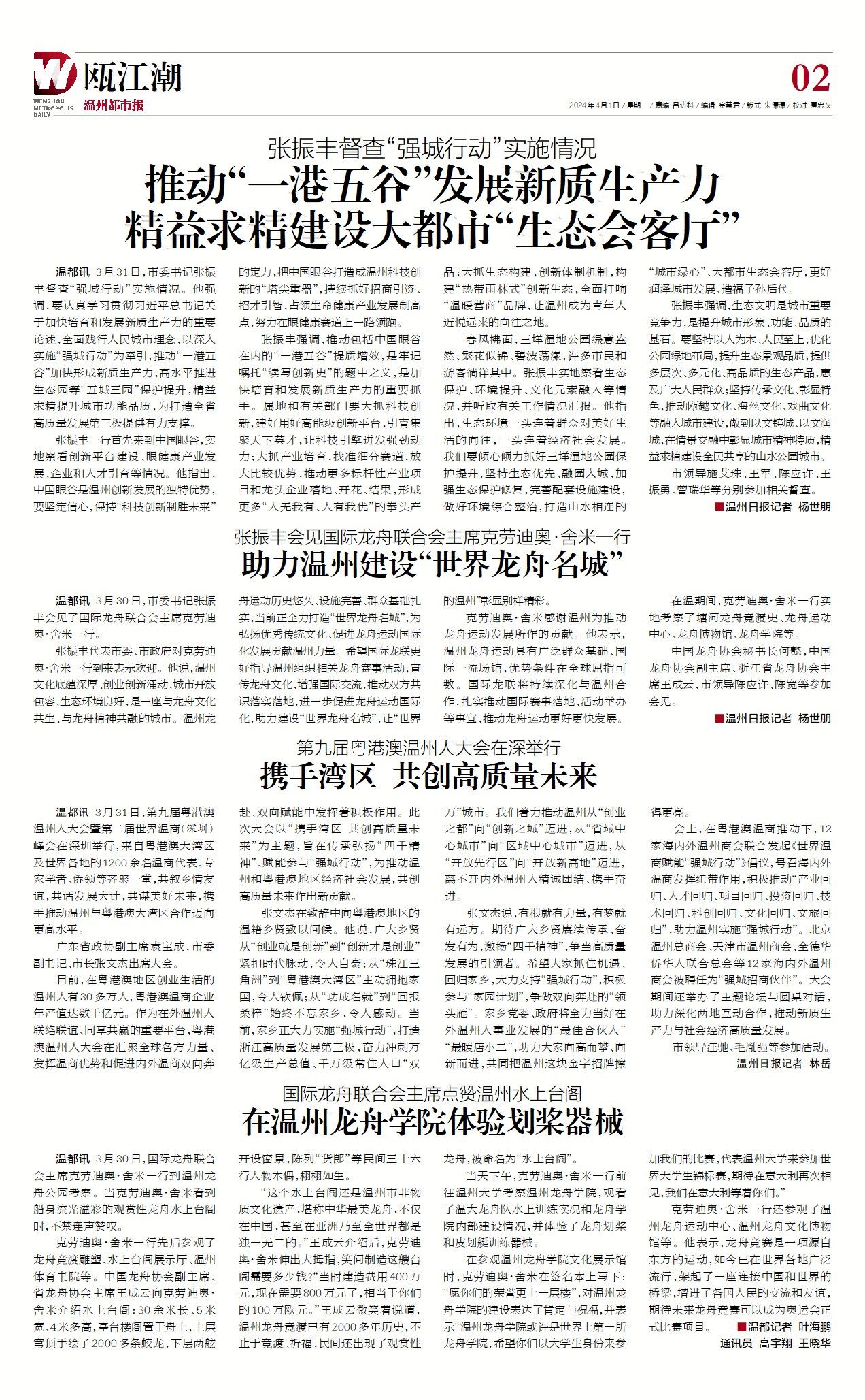 3月30日,国际龙舟联合会主席克劳迪奥·舍米一行到温州龙舟公园考察。当克劳迪奥·舍米看到船身流光溢彩的观赏性龙舟水上台时,不禁连声赞叹。