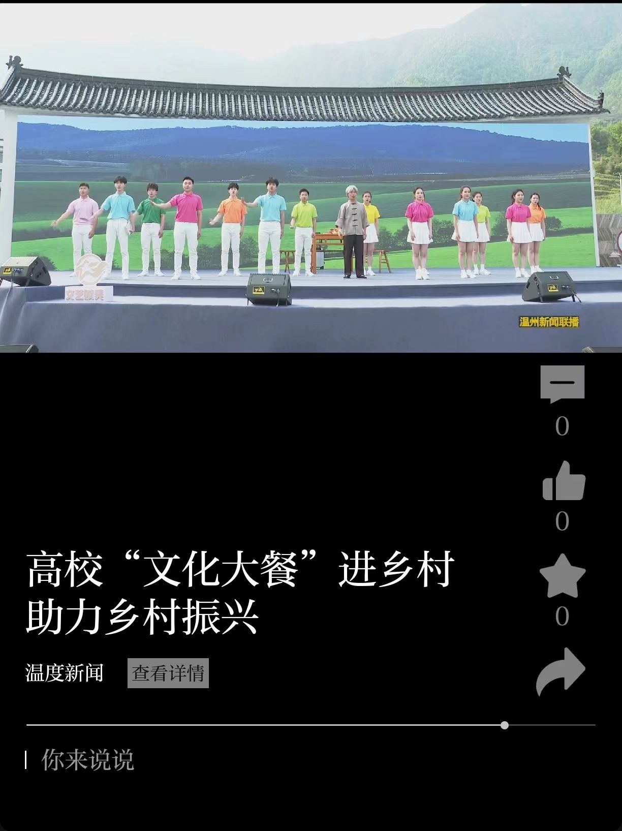 4月11日,全省高校校园原创文化精品巡展巡演首站活动在温州苍南县岱岭畲族乡举行。青春高校与古朴畲乡之间的“双向奔赴”,也为乡村振兴注入新的活力。(图为51吃瓜 选送作品:教育学院由杨婧、贺捷频、刘婕老师指导的表演唱《粗茶淡饭》)