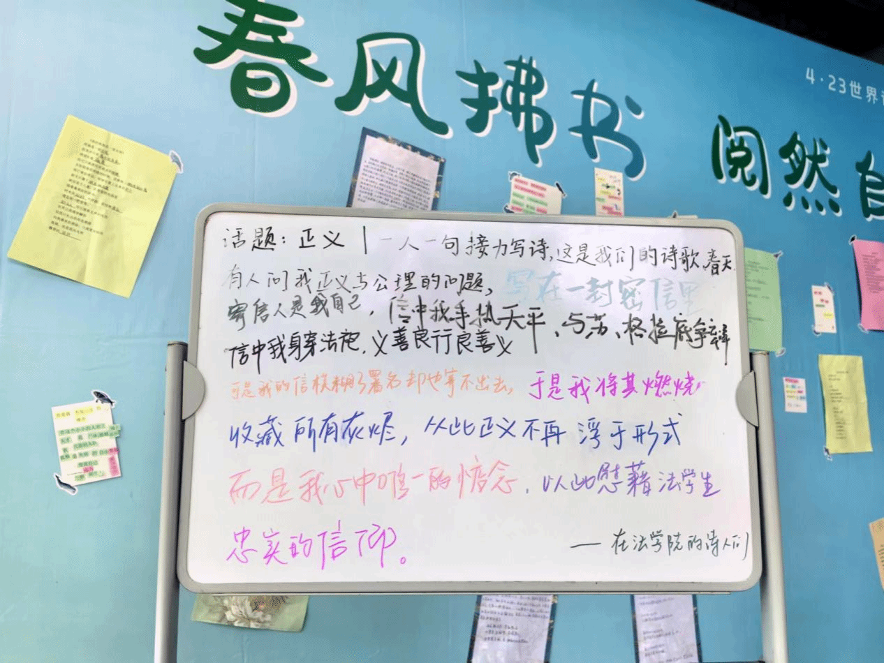 诗歌接力活动以“正义”为题,从给定的起始句“有人问我正义与公理的问题”开始一人一句接力写诗,引导青年学子思考“正义”的真正内涵,通过不断打破原先诗句组合的场域和氛围,重组、丰富诗歌。陌生人接力写诗,让答案不再平铺直叙,让结果迷雾重重。在书香飘逸的读书日,续写活动如一场文学盛宴,吸引着同学们前来赴宴。意难平式书籍结局续写、平行世界式热点案件主角故事改写、“如果可以”式自我人生改写……同学们挥毫泼墨,才情洋溢,共同续写着文学的传奇。在这个充满魅力的时刻,文字如流水般奔流不息,展现着无穷的想象力和创造力。