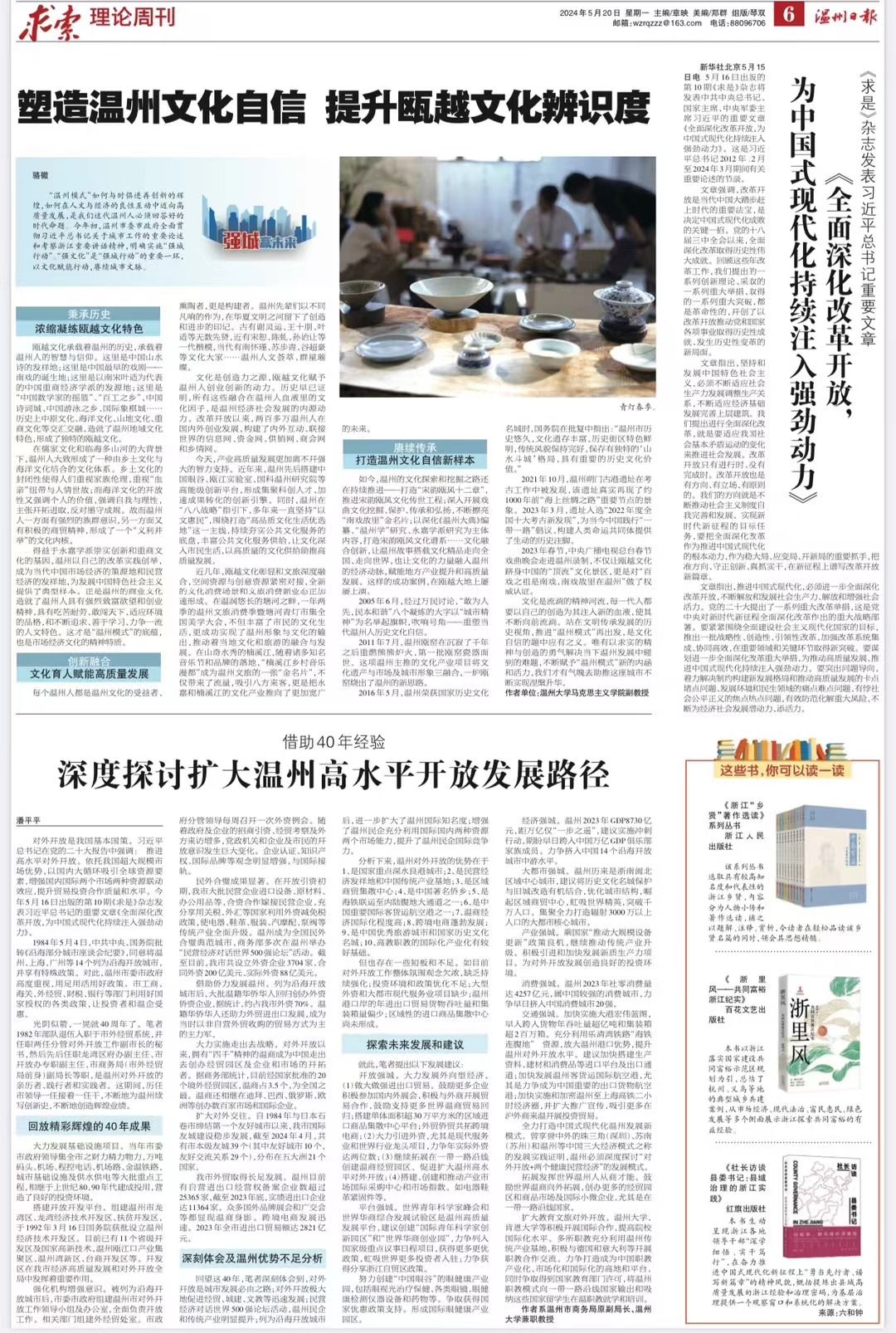 文化是流淌的精神河流,每一代人都要以自己的创造为其注入新的血液,使其不断向前流淌。站在文明传承发展的历史视角,推进“温州模式”再出发,是文化自信的题中应有之义。唯有以求实的精神与创造的勇气解决当下温州发展中碰到的难题,不断赋予“温州模式”新的内涵和活力,我们才有气魄去助推这座城市不断实现涅槃升华。