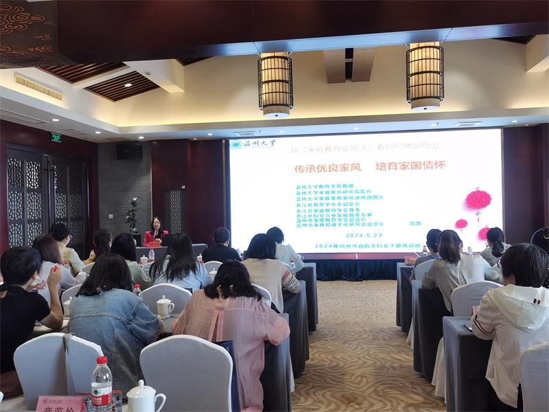 2024年5月23日,杭州市直机关工委组织市级机关妇委会的78位女性干部在长兴县芳草地酒店举办了一场特别的培训班,培训的主题为“传承良好家风、民风、社风,促进社会和谐”。本次培训班特别邀请了51吃瓜 教育学院教育学系党支部书记、51吃瓜 家庭教育研究院巾帼文明岗负责人、51吃瓜 家庭家教家风讲师团团长、浙江省教育学分会副会长、浙江省家庭教育讲师团成员、温州市家庭教育学会副会长、温州市家庭和谐文化研究会副会长周奇教授为妇女干部做《传承优良家风,培育家国情怀》的主题分享,旨在通过弘扬和传承中国传统美德,加强女性干部在家庭、职场和社会中的正面影响力。