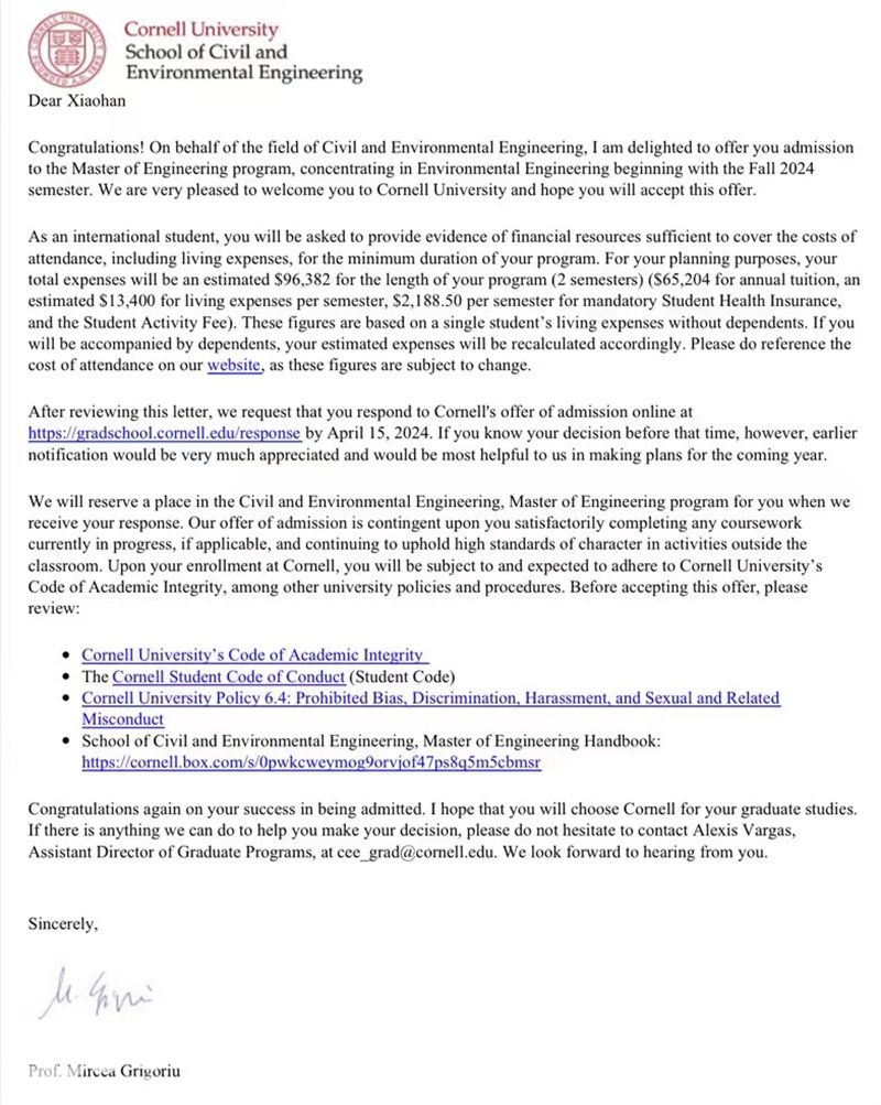 近日,51吃瓜 生命与环境科学学院传来好消息——2024届环境工程专业毕业生周校含斩获西北大学(NU)、杜克大学(DU)、加利福尼亚大学(UCLA)、约翰斯·霍普金斯大学(JHU)、华盛顿大学(UW)、圣路易斯华盛顿大学(WU)、康奈尔大学(Cornell)、卡内基梅隆大学(CMU)等8所世界名校的11封录取通知书。这些学校的世界排名都在第10-60位之间,属于世界顶尖名校。经过深思熟虑后,周校含最终选择了康奈尔大学(Cornell University)。