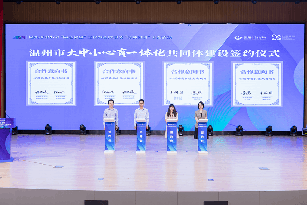 活动现场,温州市委政法委、温州市教育局、温州市公安局、温州市卫健委、温州团市委、温州市妇联共同成立“温心健康守护联盟”,进一步加强部门协作,实现资源共享、信息互通和服务互补,打造社会心理服务体系下的儿童青少年心理健康管理机制,多方合力筑牢学生心理健康“免疫墙”。