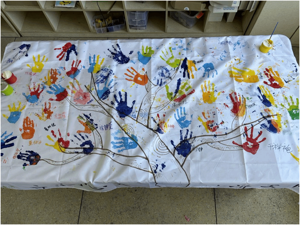 北阁村是浙江第一批省级低(零)碳试点村,时值“全国低碳日”,实践队成员通过“树叶发型师”“垃圾分类套圈圈”“环保飞行棋”“制作生态瓶”等九个游戏以环保游园会的形式开展了多样的理论宣讲、课堂实践、家教服务等关爱留守儿童的公益课堂活动。孩子们或化身为正义的“环保小判官”,用稚嫩却坚定的声音宣告着对环保的承诺;或化身为“小小观察员”,带着好奇与敬畏,发现自然的“生命曙光”;或化身为“小小接班人”,穿越时空,从历史的长河中汲取智慧,明白了可持续发展的重要性。课堂后,孩子们用黄绿色油彩在“生命”守护树上留下了自己的“手印”,表达一起“手”护每一个生命成长的青春未来的美好期冀。