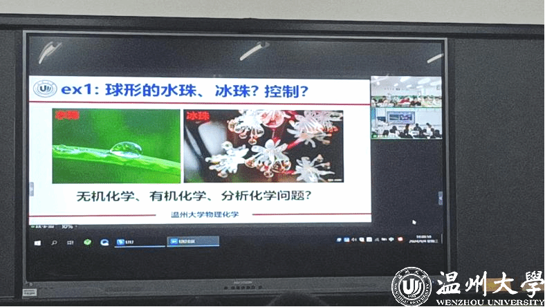 课堂上,王舜教授围绕“物理化学绪论”主题,以深入浅出的方式,首先提出了“为何学”物理化学的思考,通过一系列引人入胜的实例——球形水珠与冰珠的奇妙变化、面粉爆炸的科学解释,以及硅胶作为高效干燥剂的原理等,迅速点燃了学生们对物理化学的好奇心与探索欲。他以生动有趣的讲解,让复杂的物理化学概念变得直观易懂,极大地提升了学生的学习兴趣。进而以学生个性化专业发展诉求为导向,结合“学什么”、“怎么学”,顺势带领学生展开学习方法和研究对象的碰撞交流,最后从物理化学的特点引出对“悟”化人生、生涯规划的深度思考。王教授善在课堂中以细节打动人心,在潜移默化中将思政之“盐”溶于课程之“汤”,在专业教育中不断增强学生的价值认同和道路自信,激发了学生立志科技报国的“课程思政”之效,得到了两校师生的热烈回应。