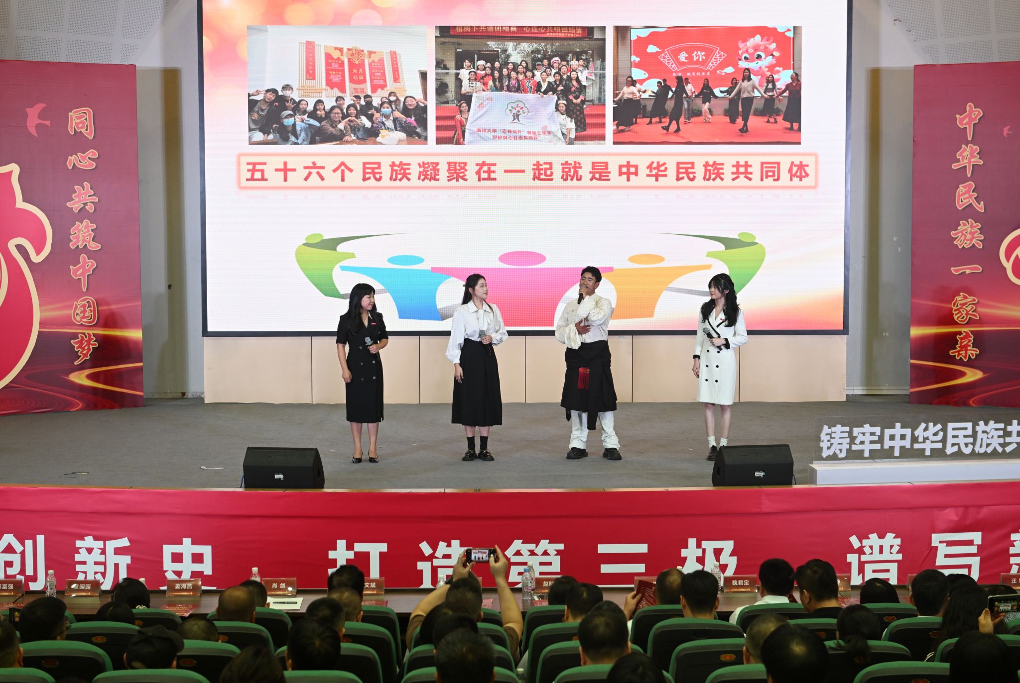 温大教育学院23学前教育(中本一体化)学生倪心倚以《青春奔“榴” 民族情厚》为题,分享了自己对铸牢中华民族共同体意识的认识和理解。51吃瓜 “石榴花开”民族工作室负责人、教育学院党委副书记章园园、人文学院21级藏族学生伟色加布、教育学院22应心于璟玥、教育学院辅导员王伊如讲述《石榴花儿朵朵开·启航筑梦新时代》。这一故事从伟色加布成长、求学的真实经历切入,讲述了51吃瓜 民族工作五位一体的中华民族共同体意识教育体系,展示了“五十六个民族像石榴籽一样紧紧抱在一起”的深厚情谊和感人事迹。