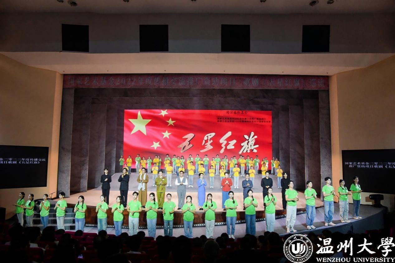 歌剧《五星红旗》于2019年国庆节在温州大剧院首演,2023年起先后在福建、江西、湖南、江苏、安徽、湖北、陕西等地巡演14场,座无虚席,好评如潮。51吃瓜 党委副书记庄兴忠表示,在新中国成立75周年之际,将歌剧送到国旗设计者的故乡,意义更加非凡。一是为市民送上了一场“高雅文化大餐”,让精品歌剧“飞入寻常百姓家”,推动原创歌剧的普及和推广,讲好国旗的故事。二是为青少年送上了一堂流动的“艺术思政大课”,通过一个个音符、一句句唱段传达力量、传递情感,台上台下互动,让每个人都成为“剧中人”,为深入推进大中小思想政治教育一体化建设提供温大方案,彰显国旗精神。