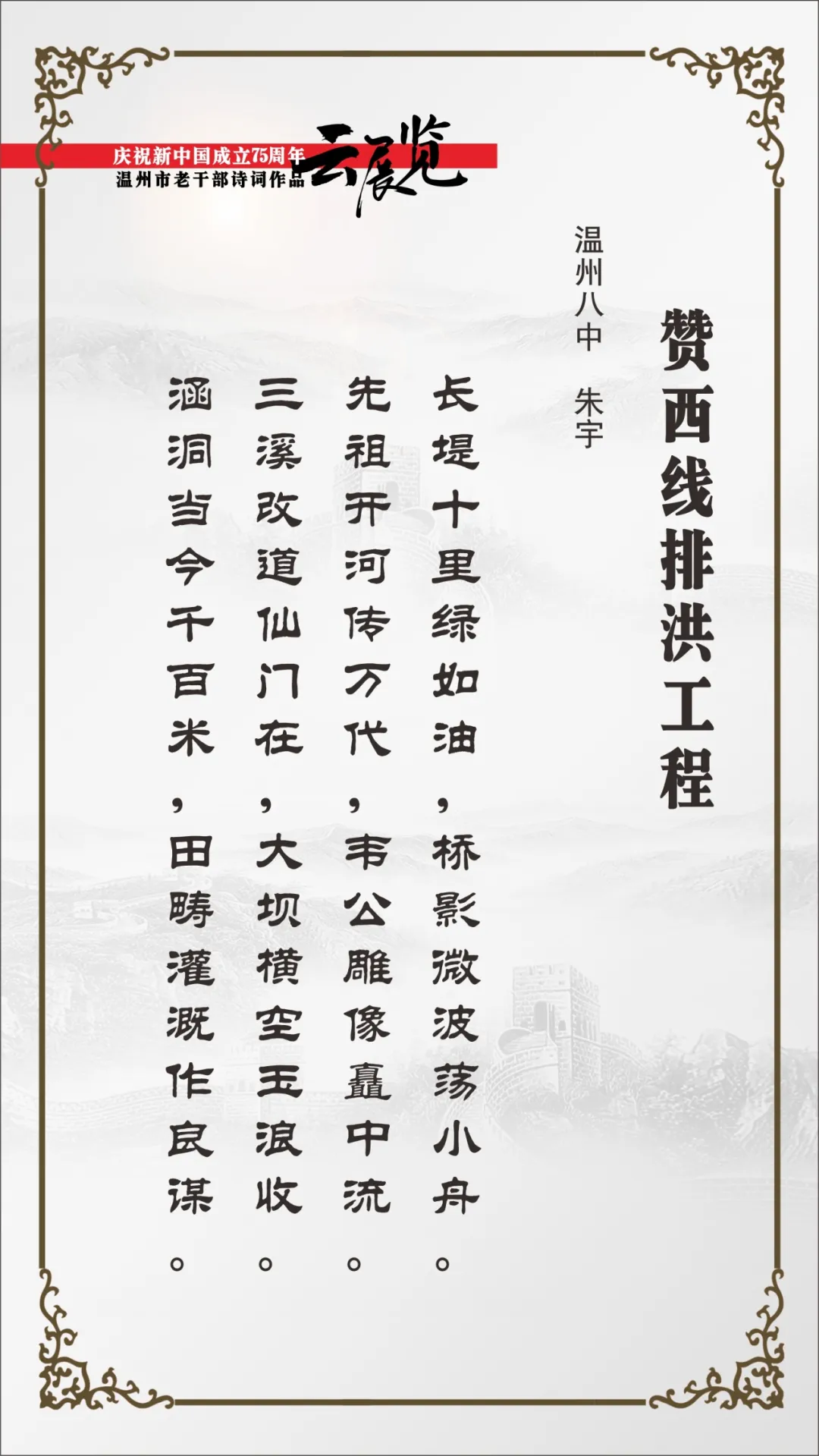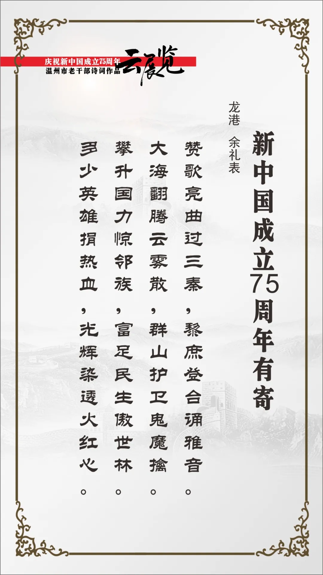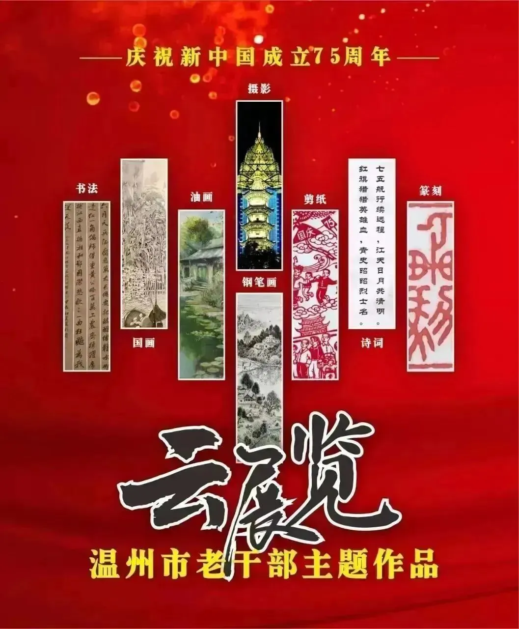 翰墨书盛世,丹青绘风华。为喜迎中华人民共和国75周年华诞,温州市委老干部局举办庆祝新中国成立75周年温州市老干部主题作品云展览。本次云展览将分批展出老同志的诗词、书画、摄影、篆刻、剪纸等作品约180幅,其作品内容积极向上,艺术趣味高雅,形式丰富多彩,充分展现出推进强国建设、民族复兴伟业的壮美华章,有力表达了温州老干部礼赞新中国、奋进新时代的美好祝愿。
