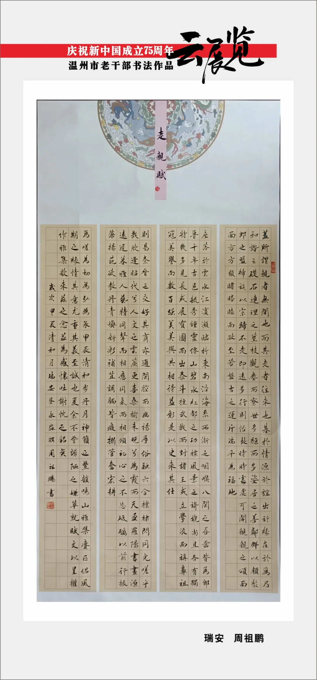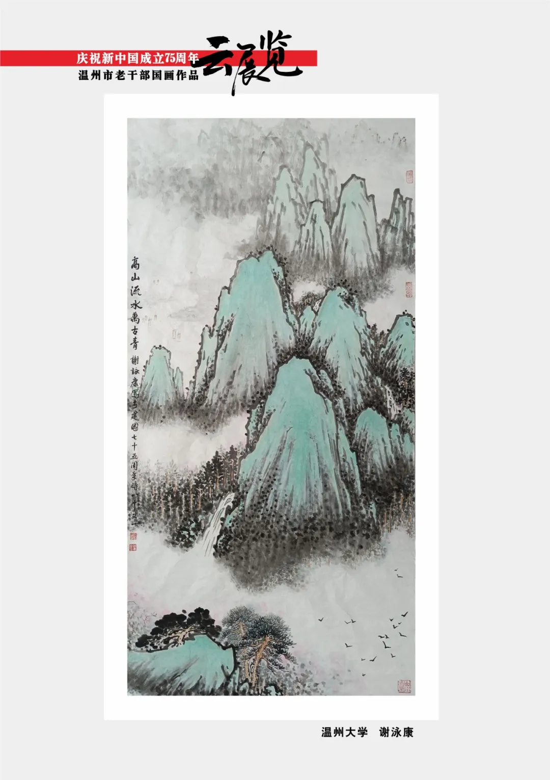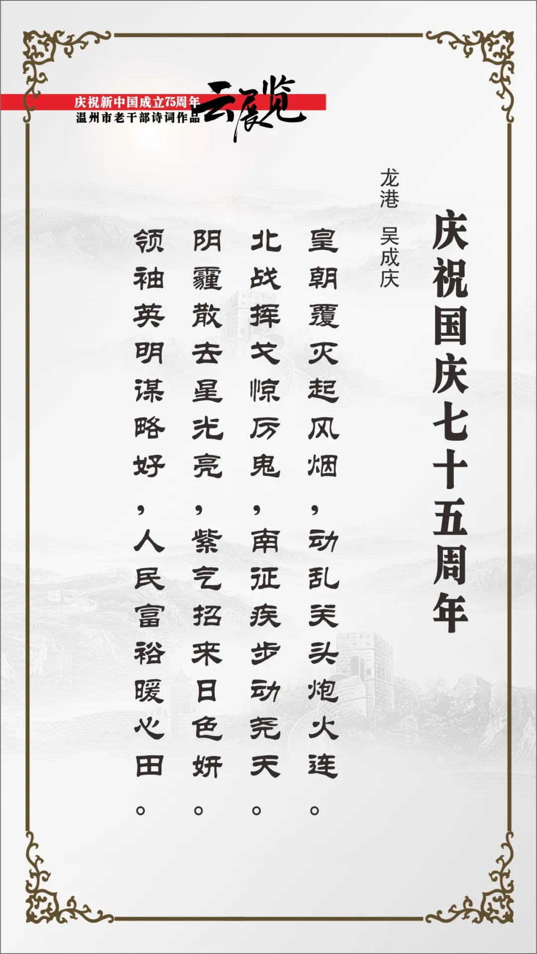 翰墨书盛世,丹青绘风华。为喜迎中华人民共和国75周年华诞,温州市委老干部局举办庆祝新中国成立75周年温州市老干部主题作品云展览。本次云展览将分批展出老同志的诗词、书画、摄影、篆刻、剪纸等作品约180幅,其作品内容积极向上,艺术趣味高雅,形式丰富多彩,充分展现出推进强国建设、民族复兴伟业的壮美华章,有力表达了温州老干部礼赞新中国、奋进新时代的美好祝愿。