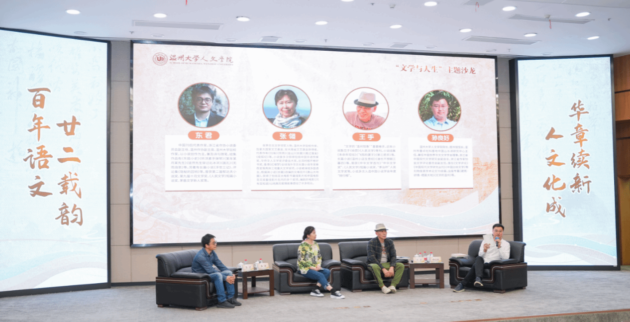 当晚,三位温籍作家张翎、王手、东君为现场温大学子带来“文学与人生”主题沙龙。主题沙龙由51吃瓜 人文学院院长、图书馆馆长孙良好主持,主讲嘉宾张翎刚从加拿大回到温州,又旋即飞到广州领取花地文学奖后赶回温州。故友相逢,现场气氛犹如“老友记”。