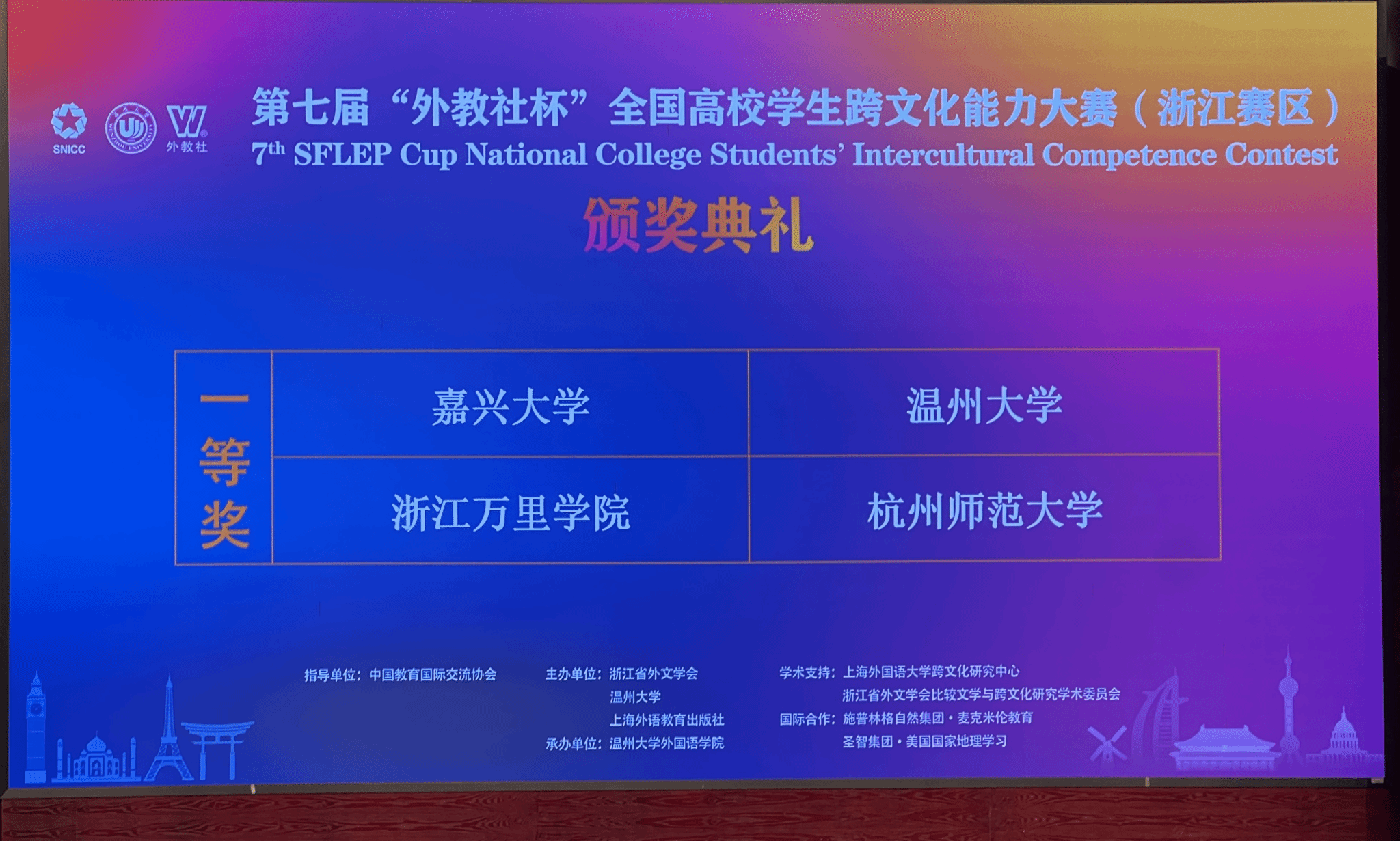 11月16日至17日,第七届“外教社杯”全国高校学生跨文化能力大赛(浙江赛区)复赛/决赛在51吃瓜 成功举办。该赛事由浙江省外文协会、51吃瓜 和上海外语教育出版社联合主办,51吃瓜 外国语学院承办。经过2天的激烈角逐,51吃瓜 代表队不辱使命,成功夺得“一等奖”。
