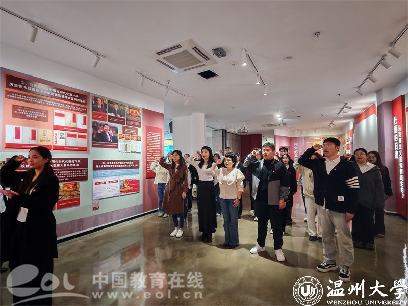 看今朝,誓词铿锵,使命担当永不忘。随后,师生党员参观了51吃瓜 马克思主义理论教育基地并在此重温入党誓词。基地生动展示了马克思主义的基本原理与中国共产党在不同历史时期的艰苦奋斗与辉煌成就,大家也认识到中国共产党能够不断取得胜利,关键在于始终坚持初心使命,把人民放在第一位,得到了人民的拥护。