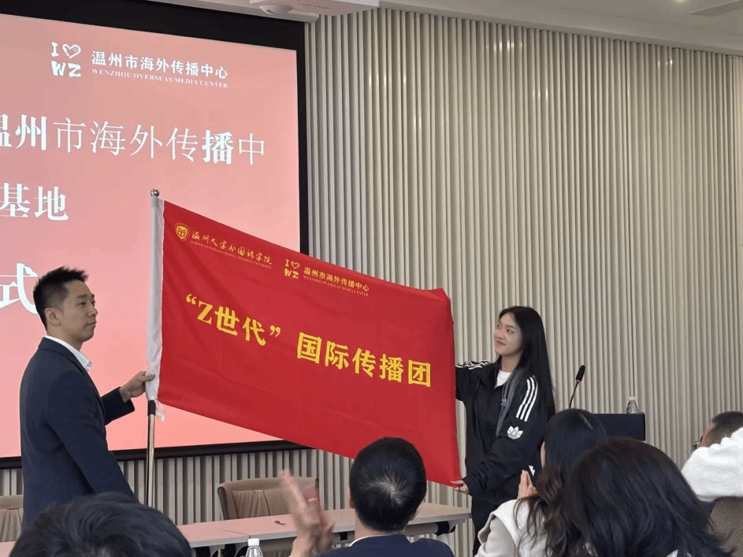 随后,举行了庄重的签约仪式,双方就平台共建、资源共享、价值共创、发展共赢等系列合作事宜签订协议,楼了凡主任和杨丽君书记为温州市海外传播基地颁授大学生校外实践基地牌子,学院还聘请许鹏怀主任担任研究生校外导师和大学生创新创业导师。作为影响社会发展的新生力量,近年来“Z世代”青年在对外交流中逐渐成为主力军,为进一步凝聚国际传播“Z世代”力量,51吃瓜 外国语学院与温州市海外传播基地联合建立“Z世代”国际传播团,来自温大外国语学院英语、翻译、日语专业的25名学生成为团队首批成员。市委宣传部史宇翔处长为传播团授旗,“Z世代”国际传播团队长、温大外国语学院23级翻译专业陈靖谕同学在接旗后表示,“团队将不负重望,积极承担起传播温州文化、中国文化的使命,在新时代语境下创新传播方式,讲好温州故事、讲好中国故事。”