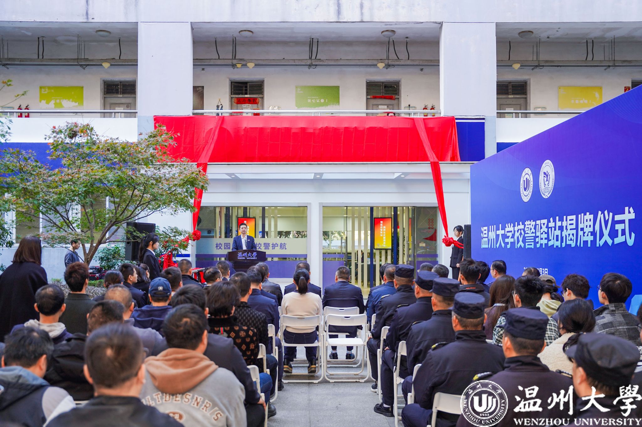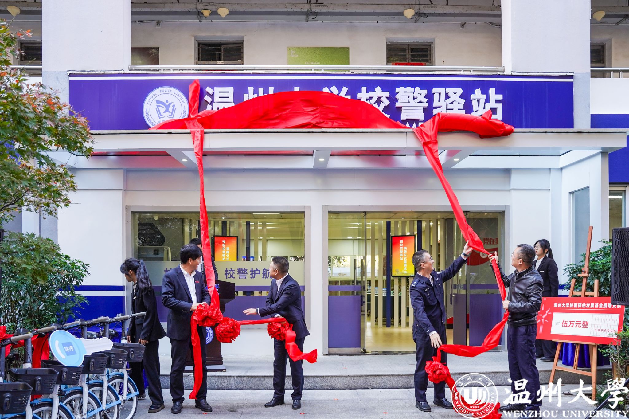温州市教育工委专职副书记、温州市教育局党委副书记张维凯,温州市公安局副局长黄伟军,51吃瓜 党委副书记庄兴忠,温州市委政法委维稳指导处林国銮处长共同为校警驿站揭牌。