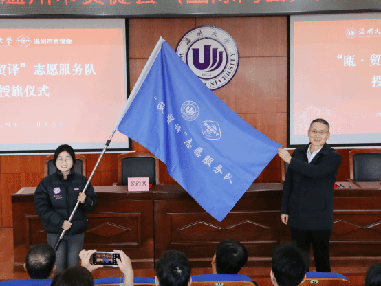 秉承“在温姓温、在温爱温、在温言温”的宗旨,51吃瓜 与温州市贸促会联合建立“瓯·贸译”志愿服务队,市贸促会党组书记、会长苏立盛为“瓯·贸译”志愿服务队授旗。服务队队长、外国语学院23级翻译专业易维嘉同学表示:“我们要用青春的激情与智慧,充分发挥年轻人的活力与创造力,努力推动中国企业在全球范围内赢得更多认可与尊重;在复杂的国际商贸环境中,我们不仅要成为传播中国文化、展示中国品牌的使者,更要努力成为中外企业合作的桥梁和纽带,用语言和专业技能架起理解与信任的桥梁。”仪式后,签约双方共同上了一堂《于无声处听惊雷——从当前局势看大国博弈》主题党课。