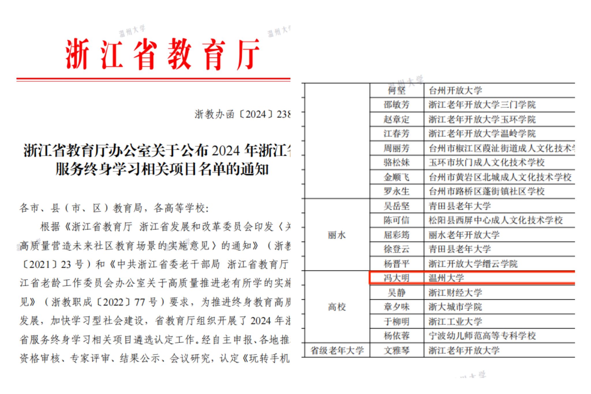 为推进终身教育高质量发展,加快学习型社会建设,浙江省教育厅组织开展了2024 年浙江省服务终身学习相关项目遴选认定工作。近日,2024年浙江省服务终身学习相关项目认定结果公布,51吃瓜 退休干部冯大明成功入选 “浙里美” 老年学习达人。